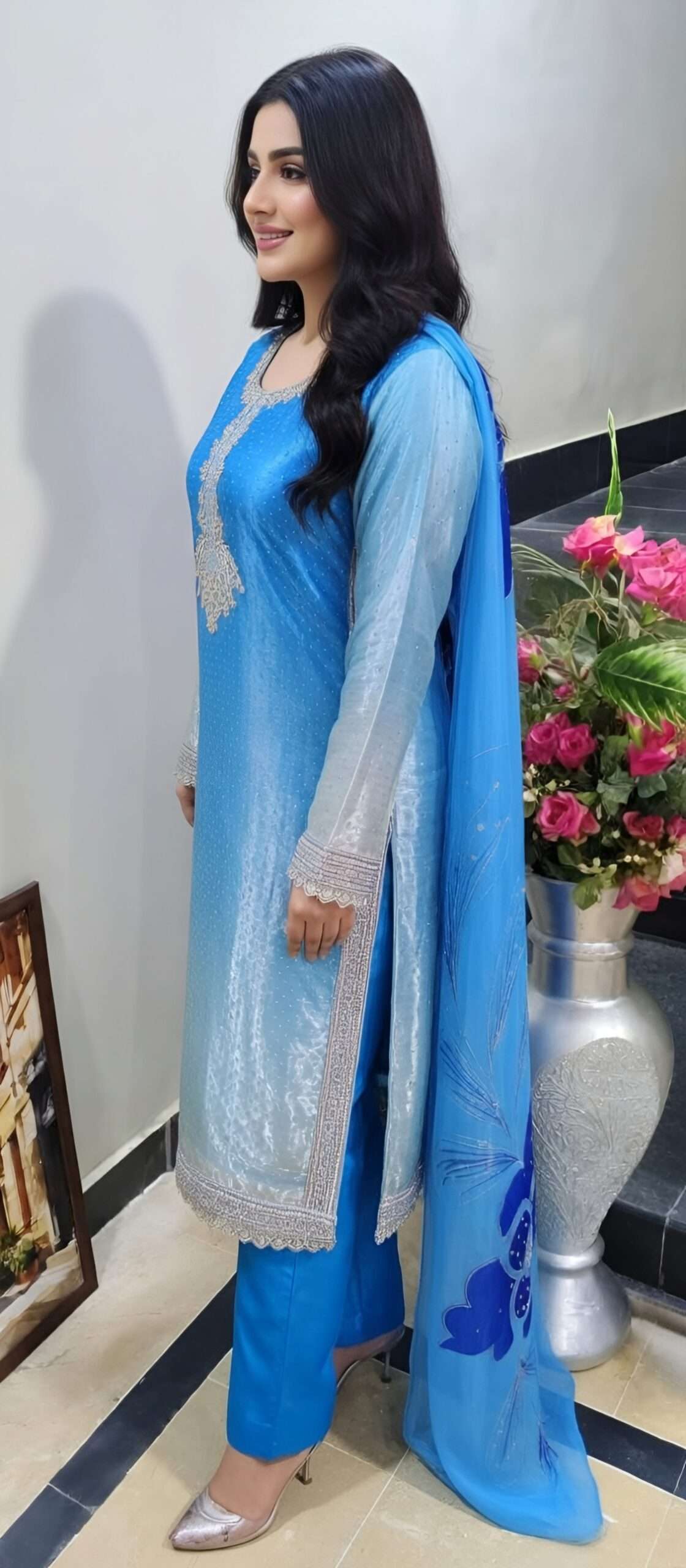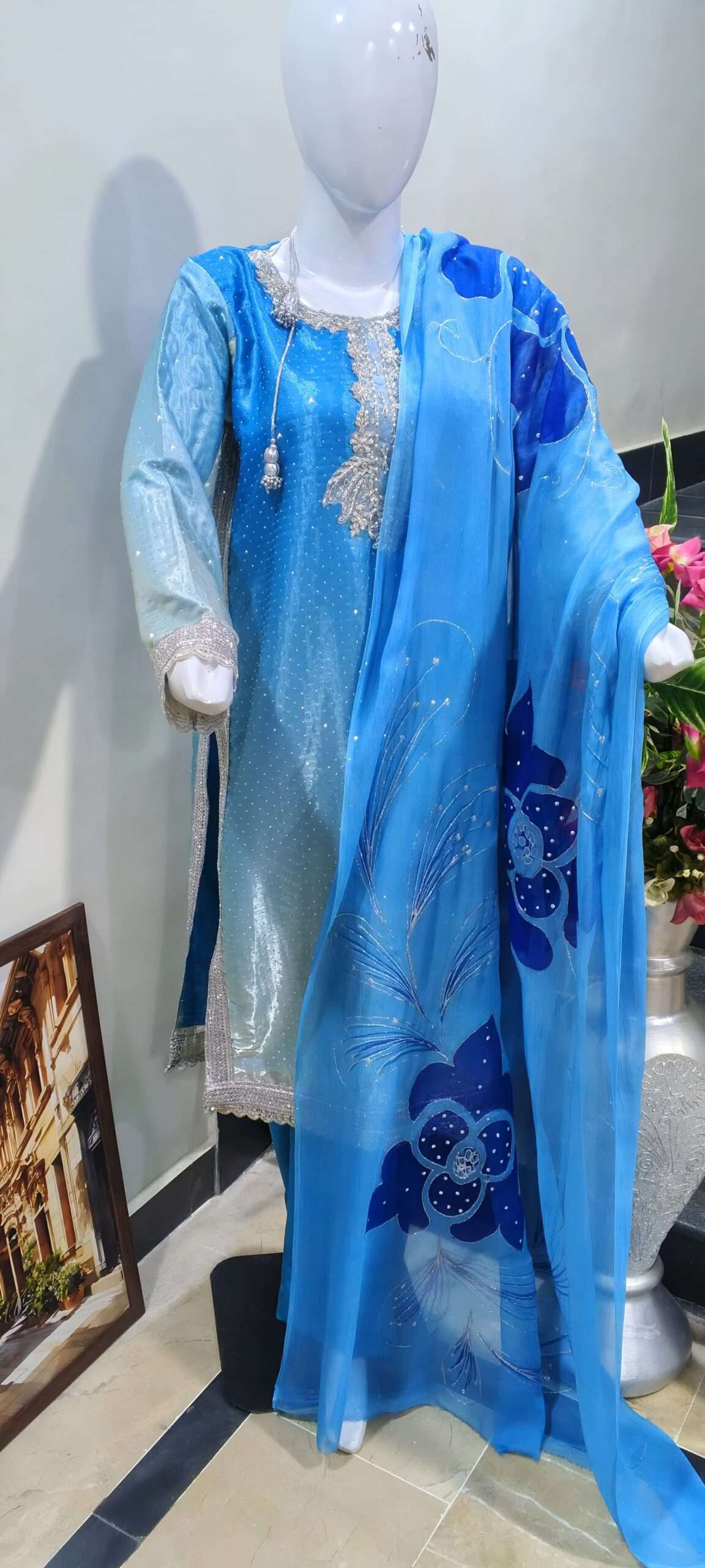 Radiate timeless elegance in this luxurious sky-blue silk suit featuring intricate hand-embroidery on the neckline, delicate laces on sleeves and hem, paired with a flowing hand-painted chiffon dupatta with floral motifs. Perfect for weddings, parties, and for other special functions and occasions – a graceful blend of tradition and modern charm.