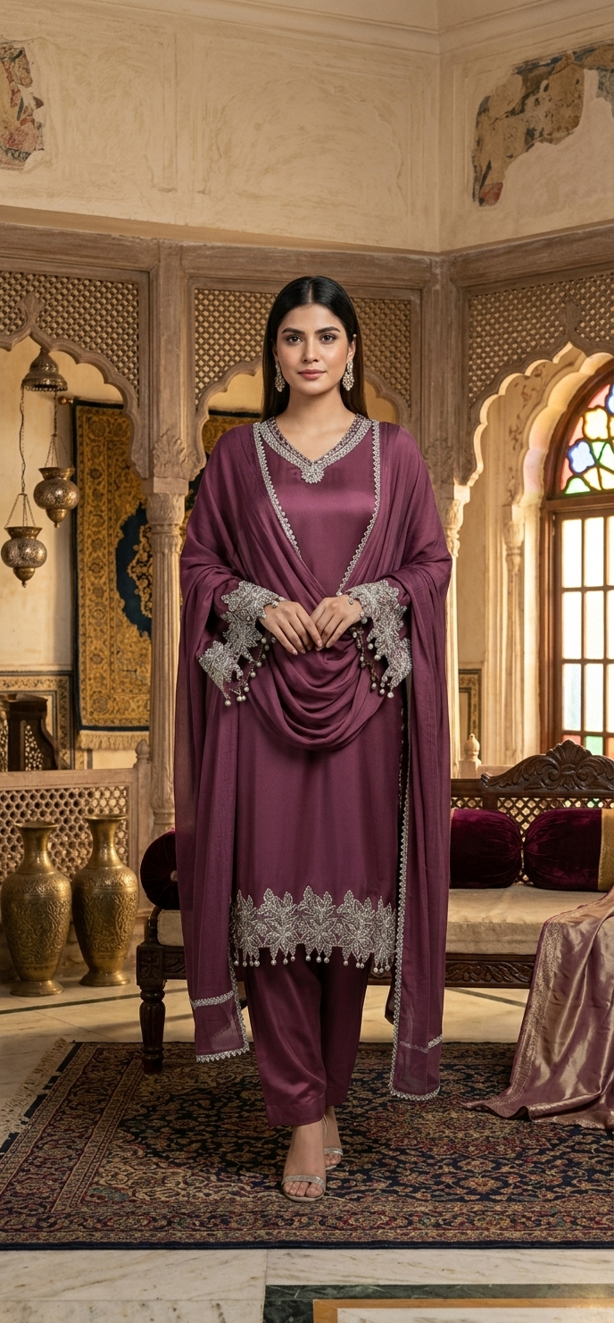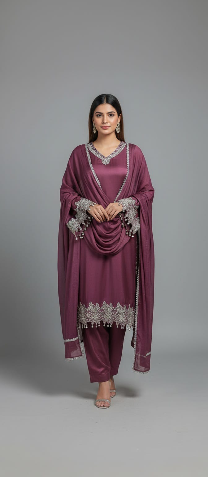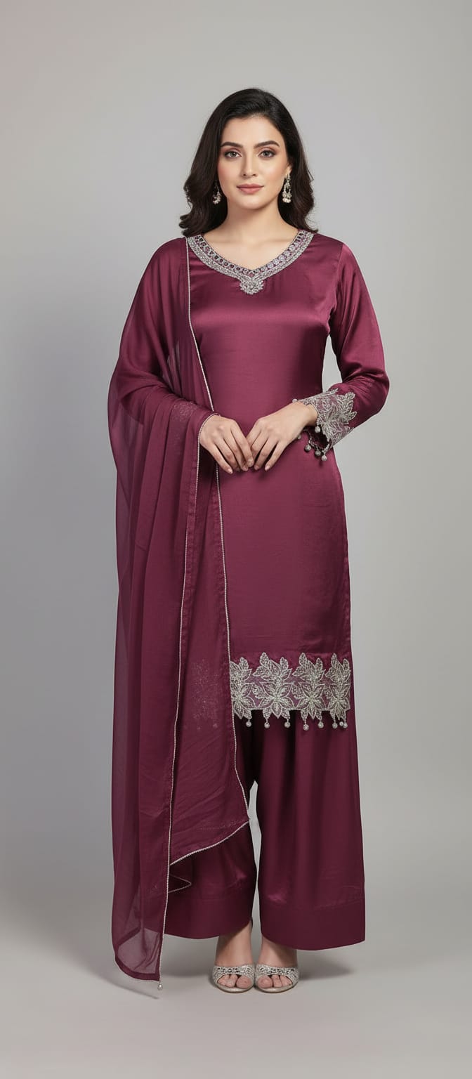 Elevate your elegance with this stunning maroon silk three piece suit featuring a luxurious satin silk kameez adorned with intricate silver embroidery and delicate pearl tassels on the neckline and sleeves. Paired with flowing wide-leg silk palazzo pants and a sheer chiffon dupatta with matching lace borders, this ready-to-wear ensemble exudes timeless sophistication. Perfect for weddings, Eid celebrations, parties, and formal occasions. Shop premium Pakistani silk suits online at Paint Outfit Studio for unmatched grace and style.