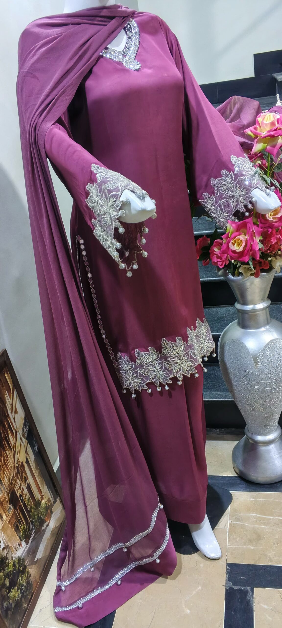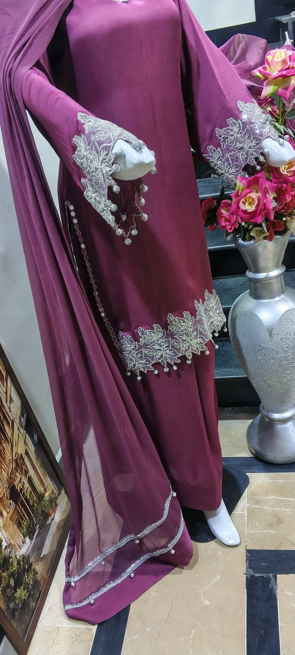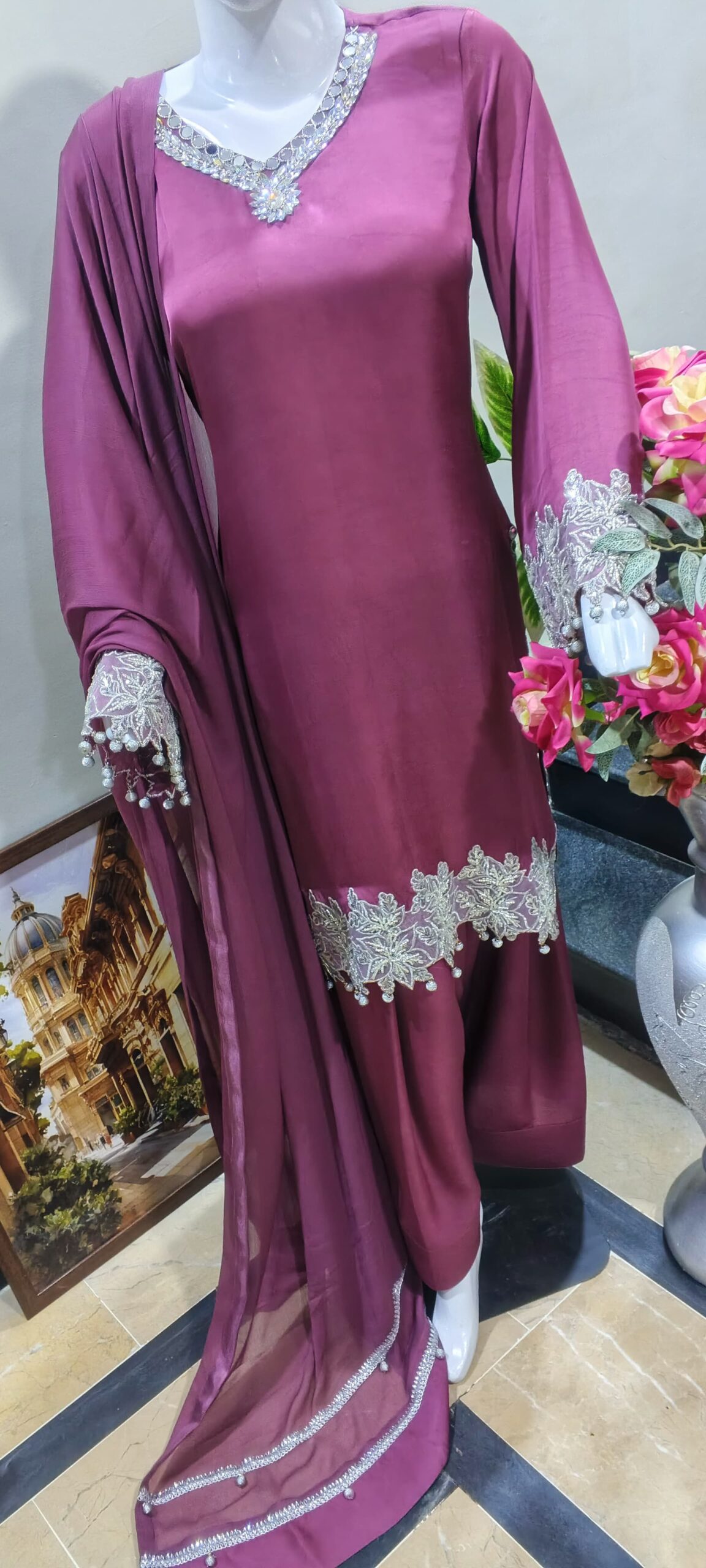 Elevate your elegance with this stunning maroon silk three piece suit featuring a luxurious satin silk kameez adorned with intricate silver embroidery and delicate pearl tassels on the neckline and sleeves. Paired with flowing wide-leg silk palazzo pants and a sheer chiffon dupatta with matching lace borders, this ready-to-wear ensemble exudes timeless sophistication. Perfect for weddings, Eid celebrations, parties, and formal occasions. Shop premium Pakistani silk suits online at Paint Outfit Studio for unmatched grace and style.
